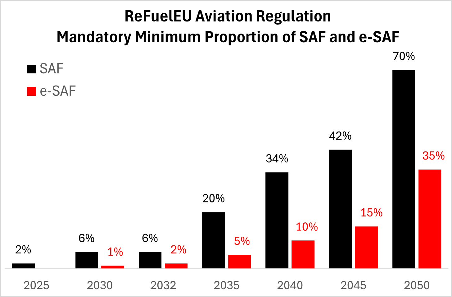 Under the ReFuelEU Aviation regulation, in force since 2025, mandatory sustainable aviation fuels (SAF) blending rises to 70% by 2050, including a 35% sub-mandate for synthetic SAF (e-SAF).